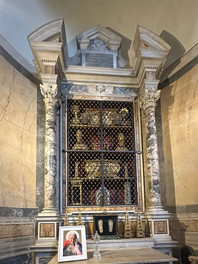 The Chapel of St. Sebastian houses his remains and his reclining statue. The last Bernini, a marble Christ from 1679, greets pilgrims at the entrance. Having resurfaced in 2001 after a long and dubious journey, the bust now stands behind glass, only weakly secured.